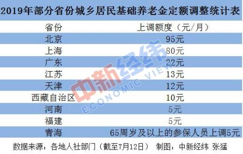 城乡居民基础养老金上调的省份中,截至发稿,上调最多的是北京市,每人每月增加95元。上海每人每月增加80元,江苏明确,基础养老金省定最低标准上调13元。天津上调12元。